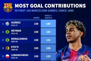 1990以来巴萨前150场参与进球榜:苏牙189球居首 亚马尔100球第十