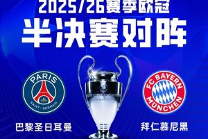 欧冠半决赛两回合对阵将于北京时间4月29日、5月6日进行;巴黎先主后客,拜仁先客后主。