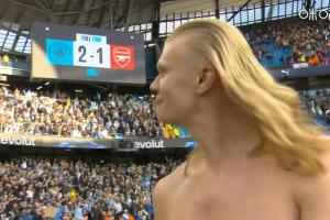 体育资讯04月20日讯 曼城本轮2-1击败阿森纳,哈兰德赛后脱去上衣,现在是金发美人哈兰德!