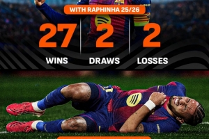 本赛季,在拉菲尼亚出战的情况下,巴萨取得了27胜2平2负的战绩,只输掉了6%的比赛。而在巴西边锋缺阵的情况下,巴萨战绩仅为9胜1平5负,输掉了33%的比赛。